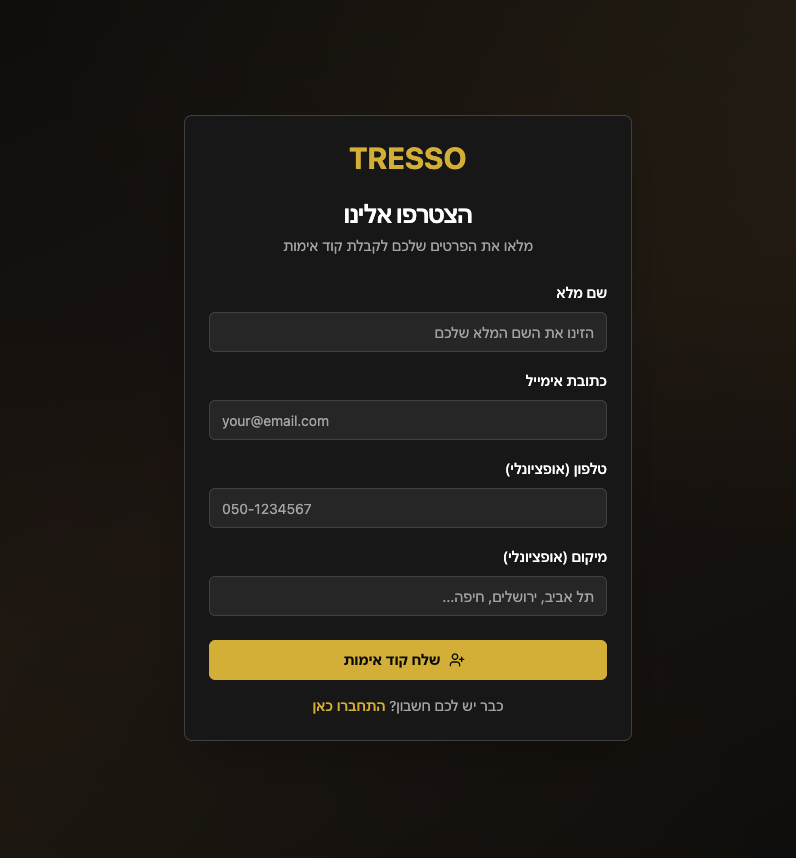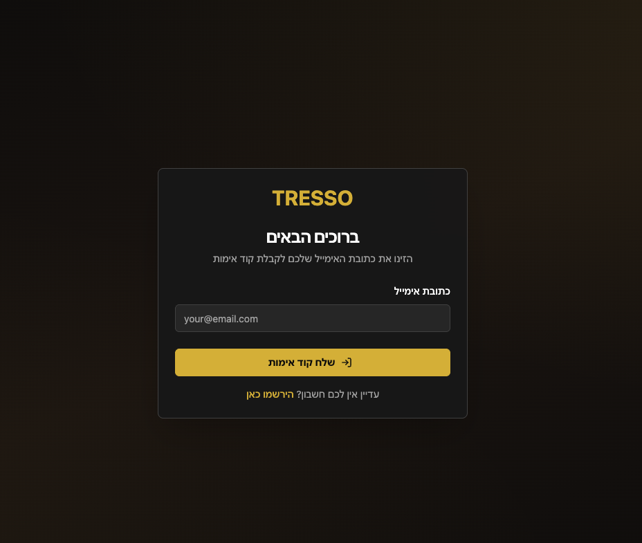 צרו חשבון חינמי באתר TRESSO. פשוט הזינו את כתובת המייל שלכם ותקבלו קוד אימות.